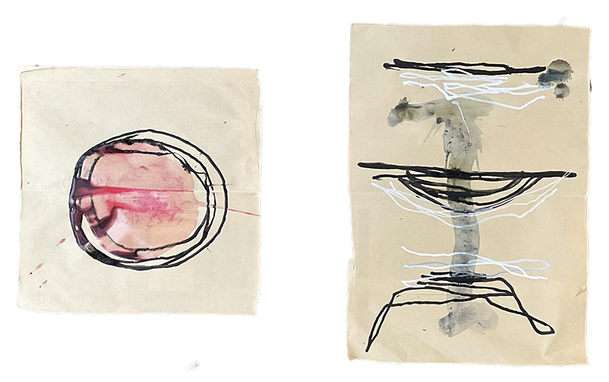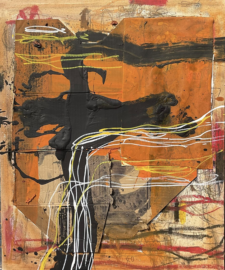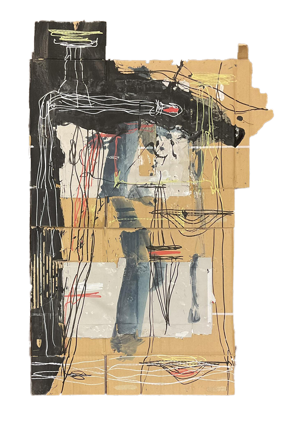 段ボールにコラージュ、ジェッソ、顔料マーカー