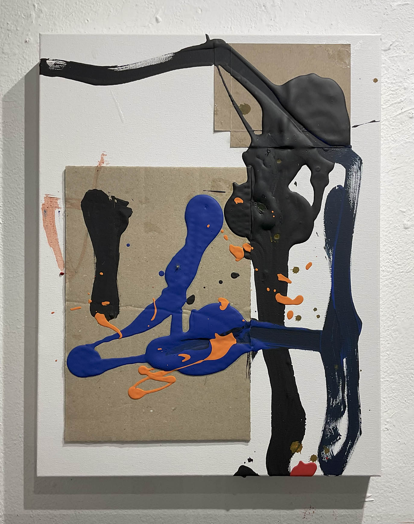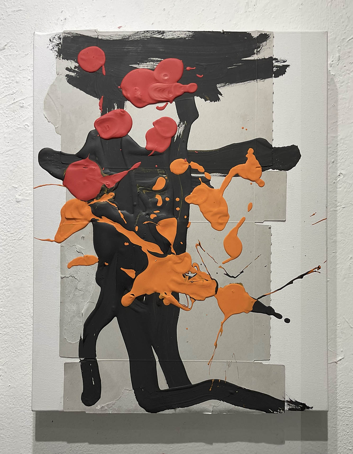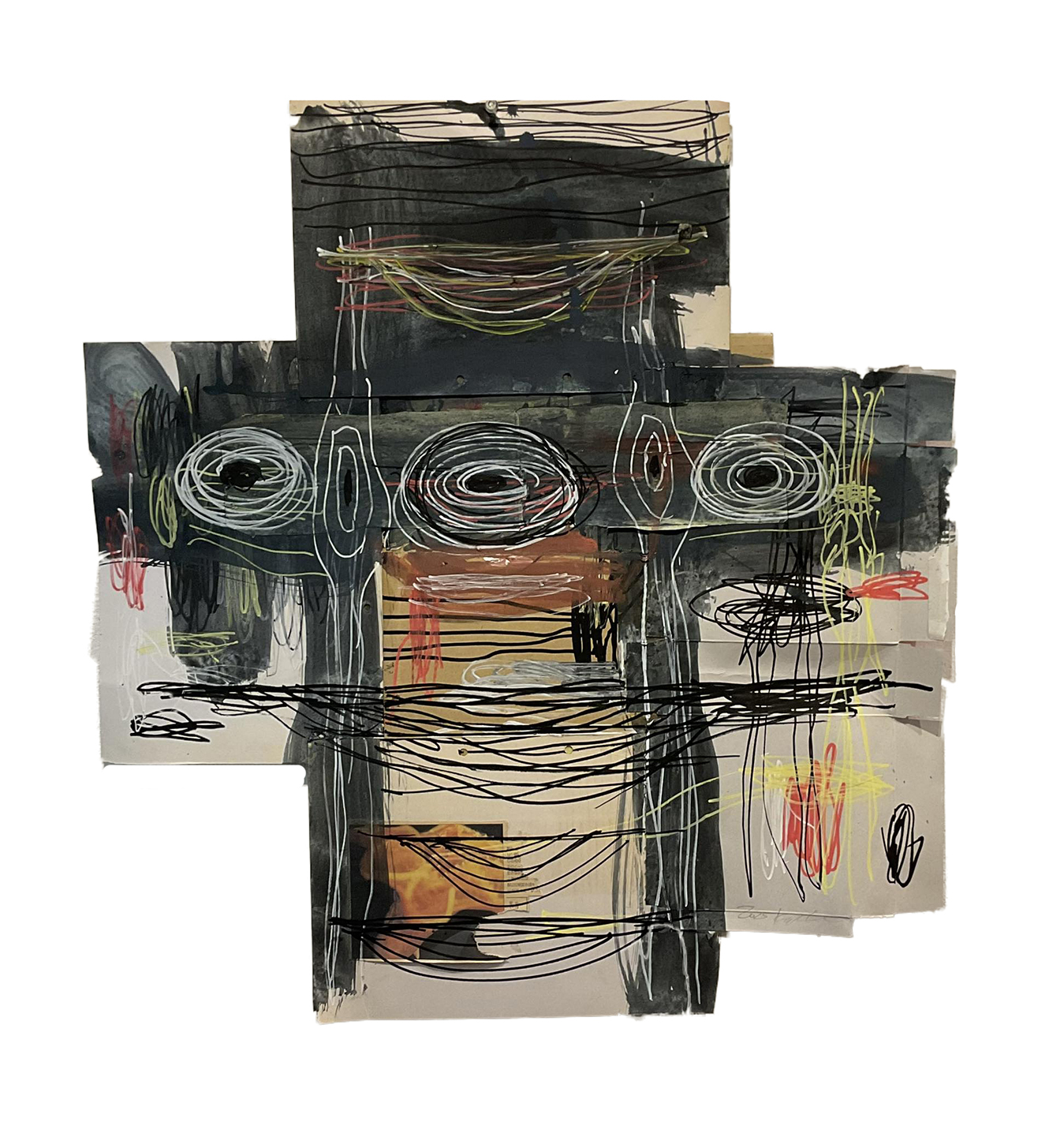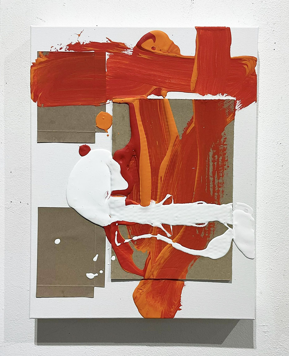 キャンバスにコラージュ、カラージェッソ、顔料マーカー