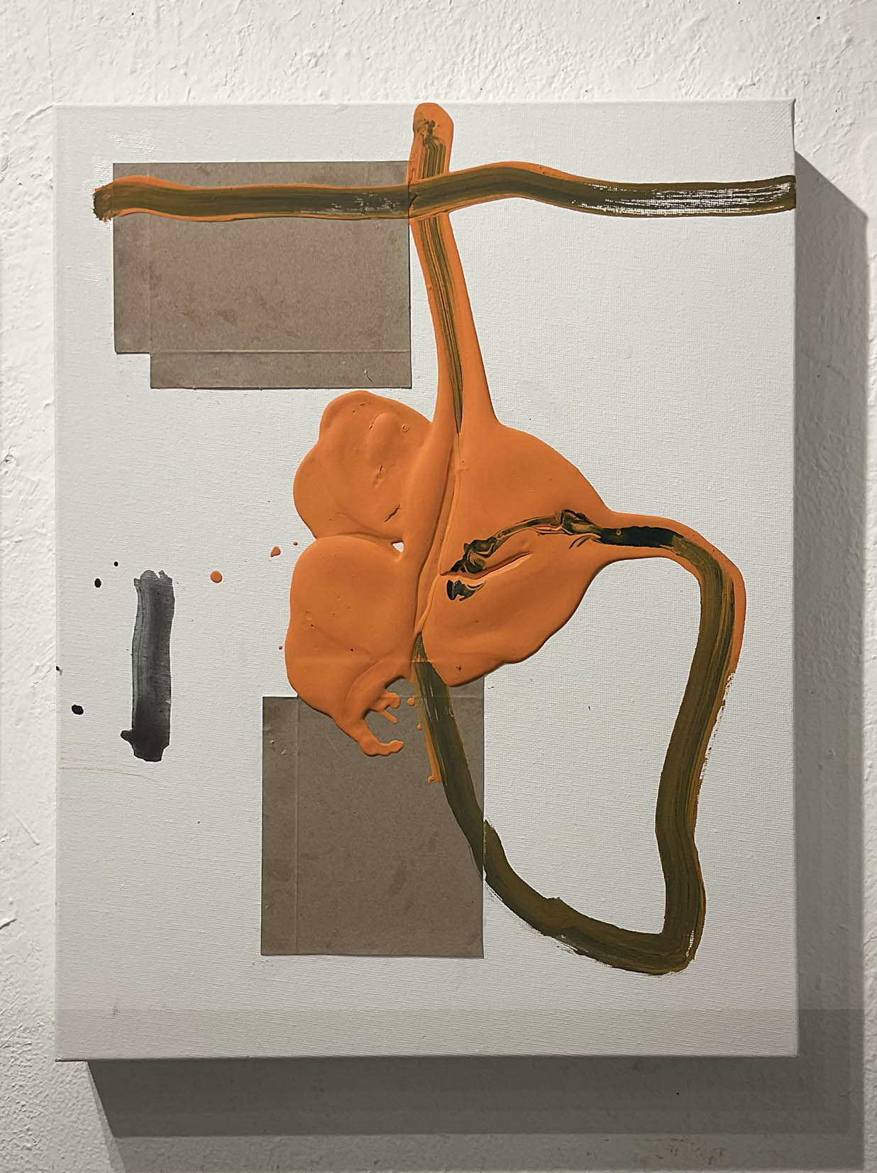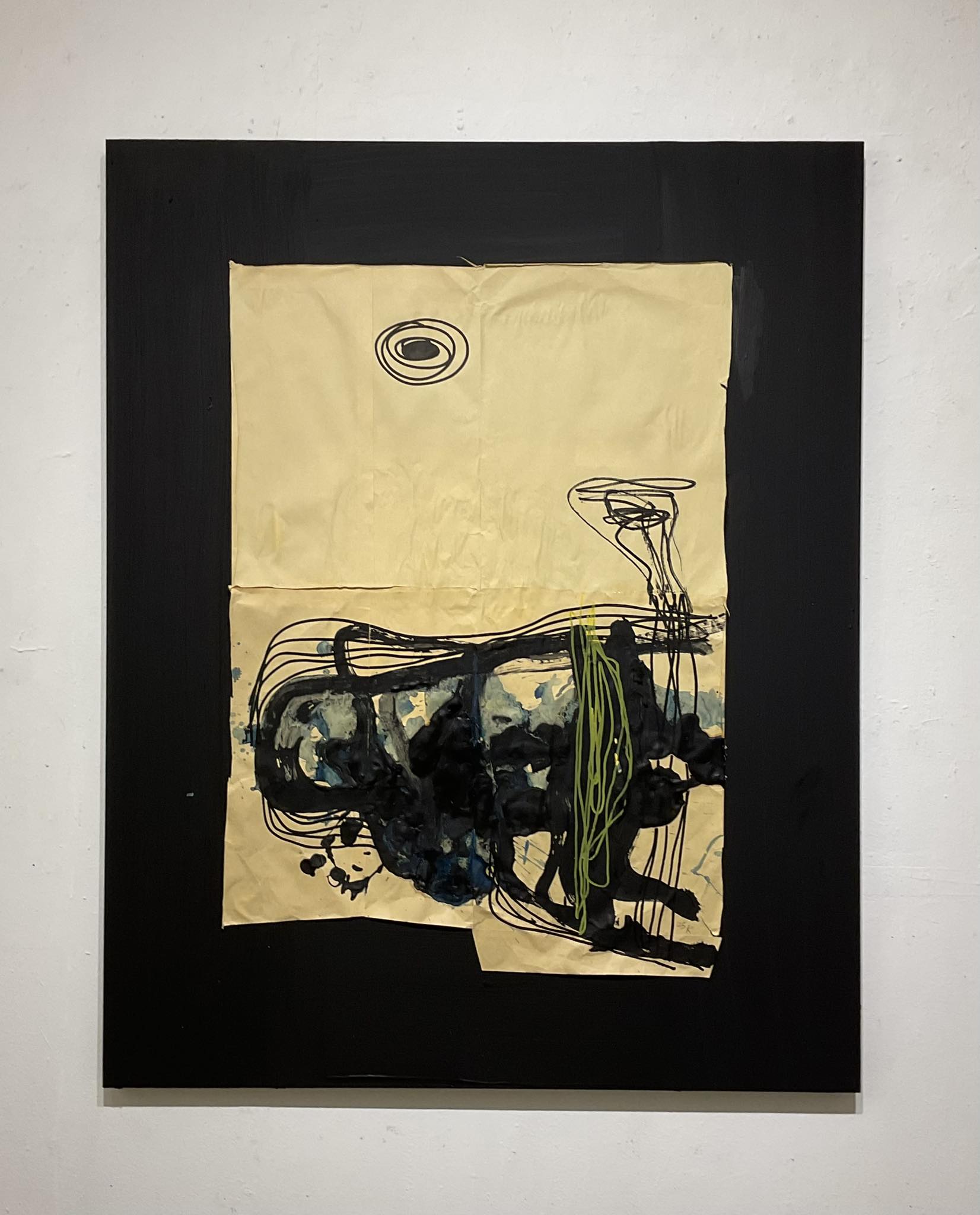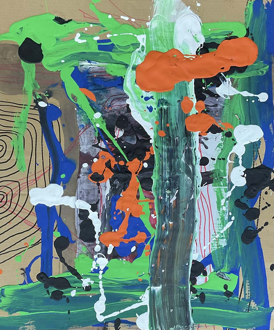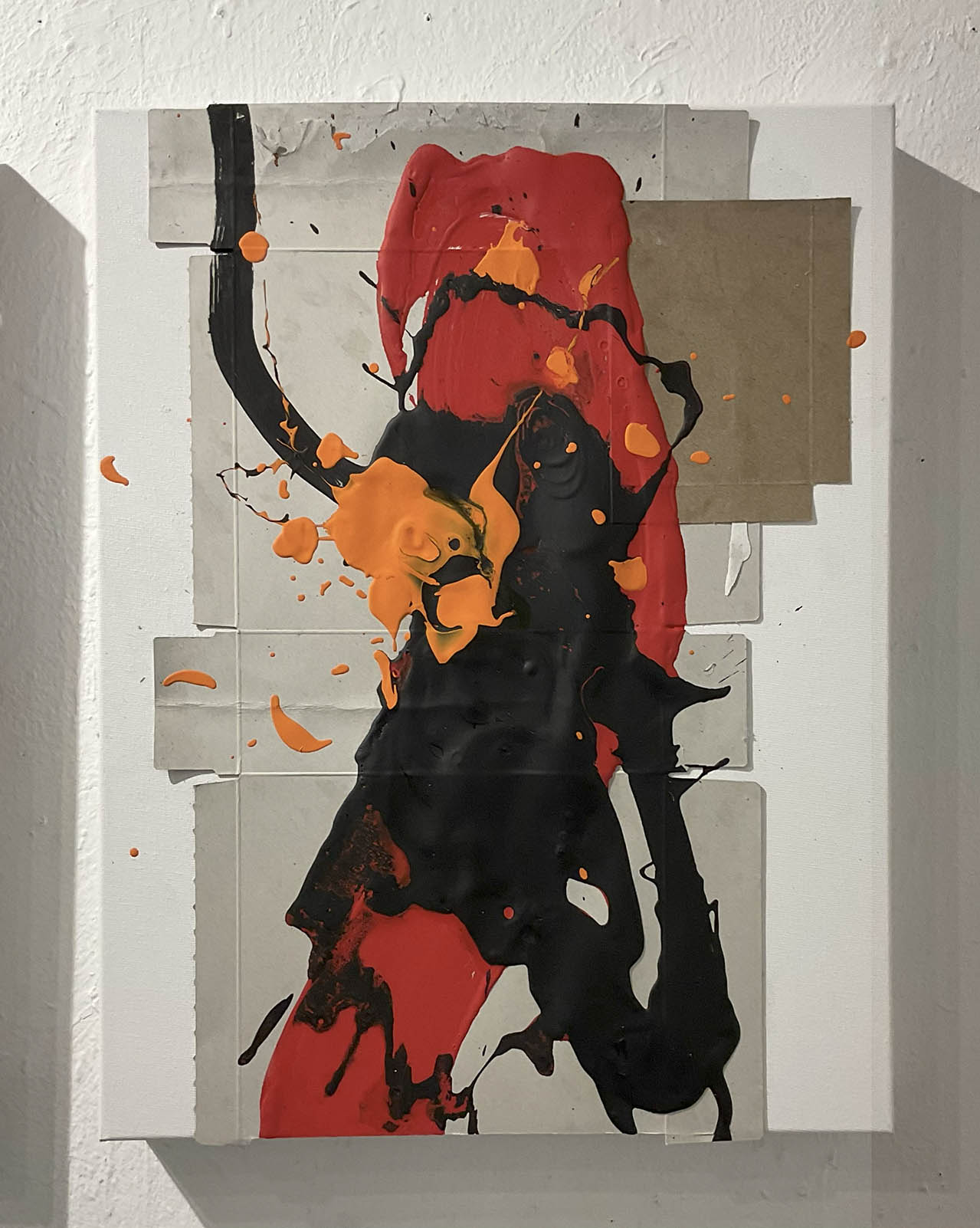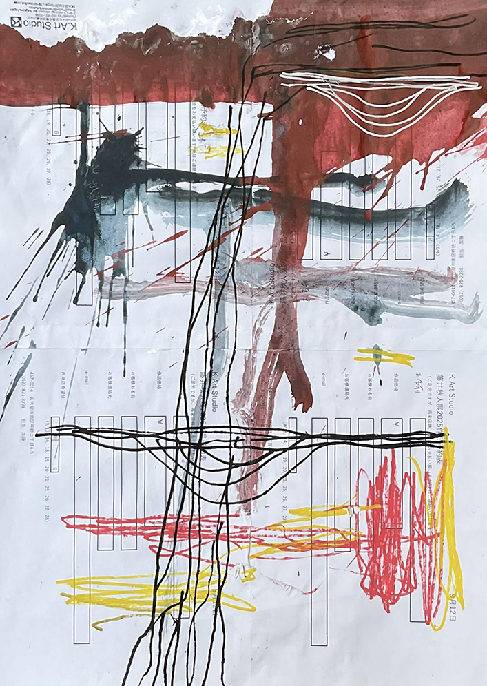 キャンバスにコラージュ、カラージェッソ、顔料マーカー