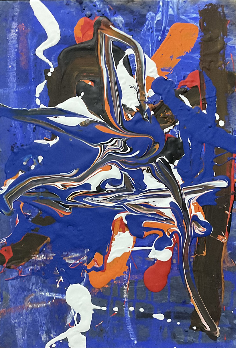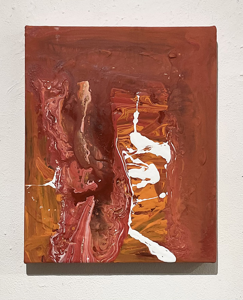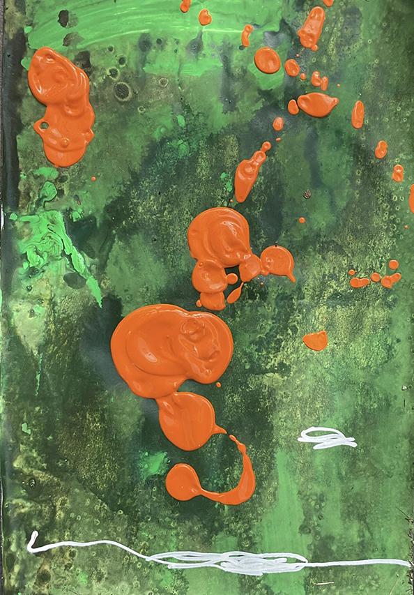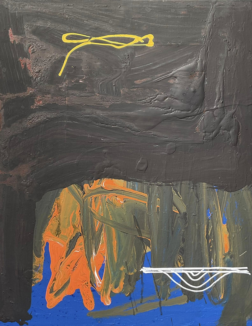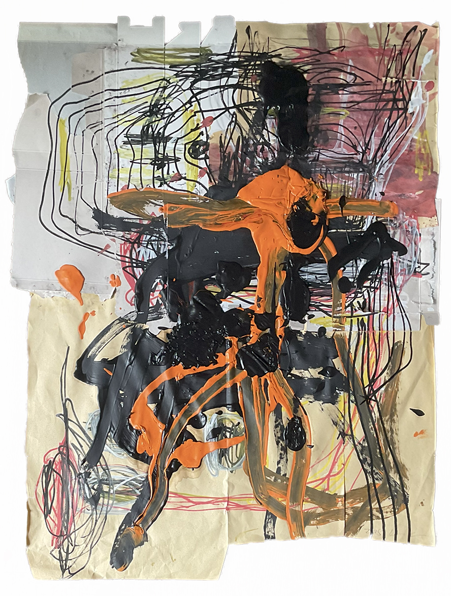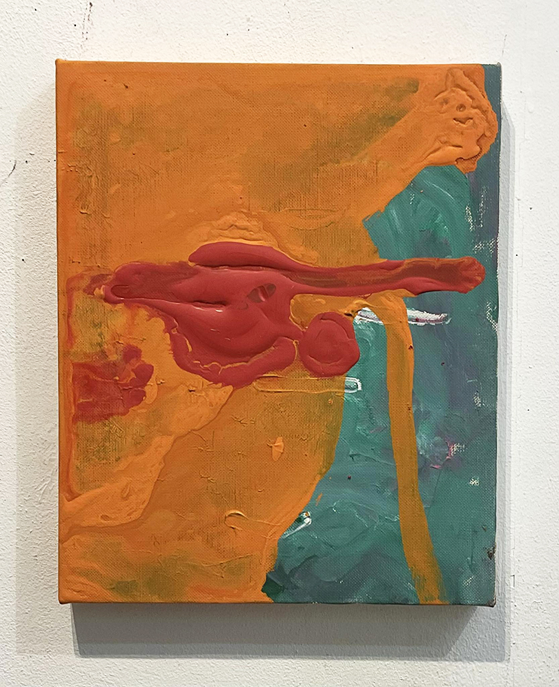 キャンバスにコラージュ、カラージェッソ、顔料マーカー