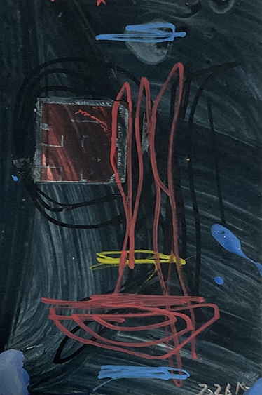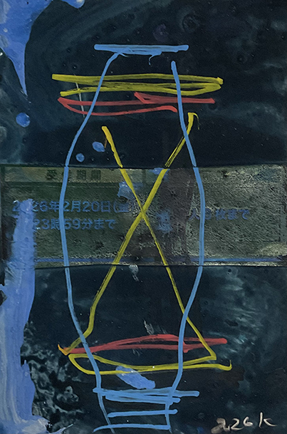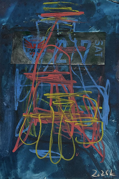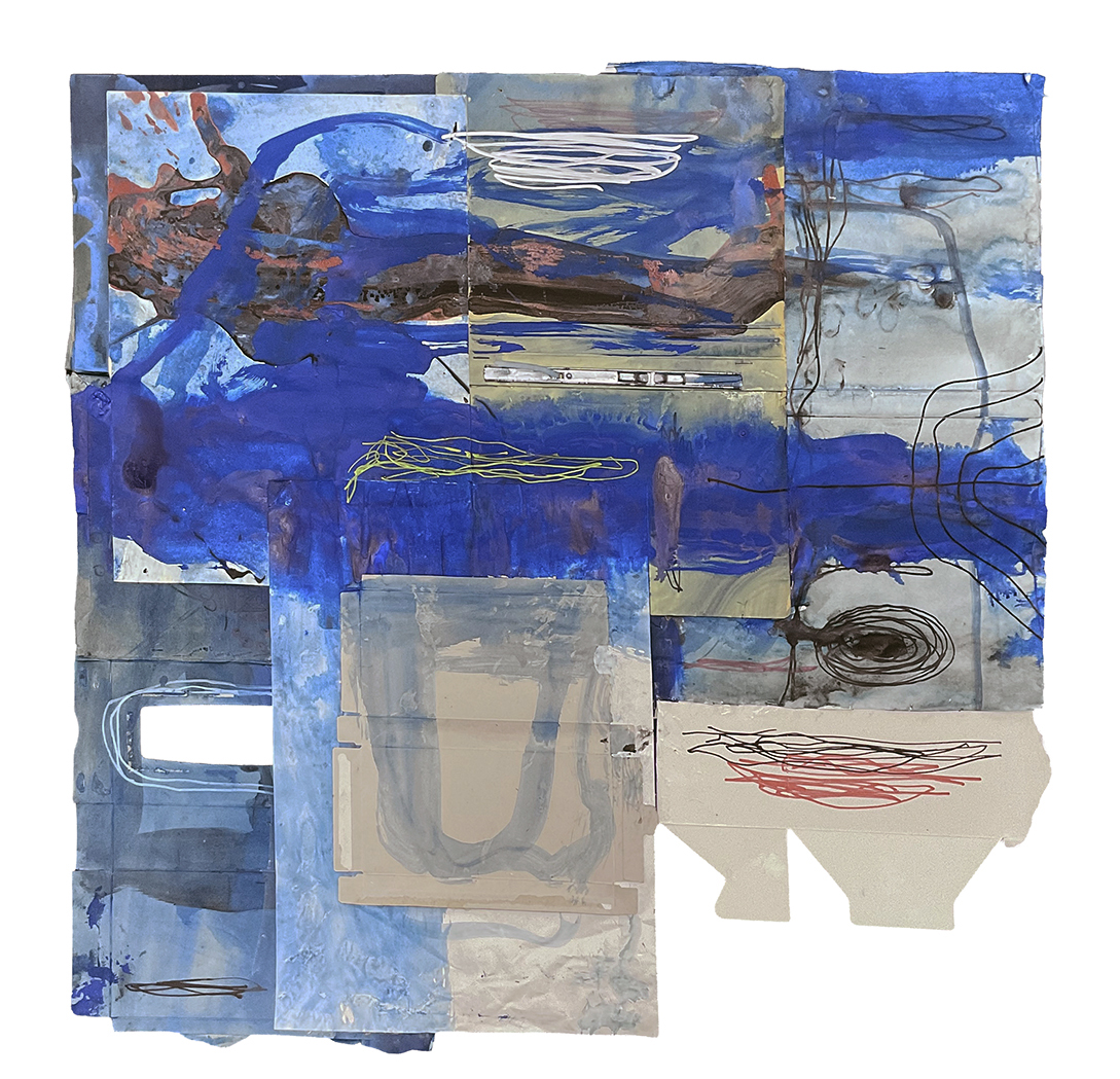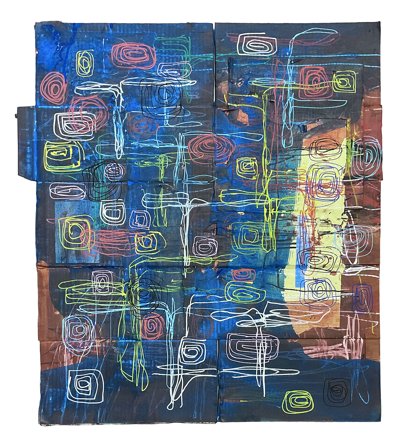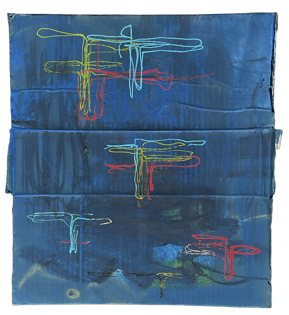 段ボールにコラージュ、ジェッソ、顔料マーカー